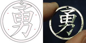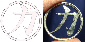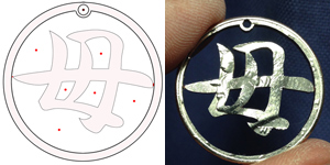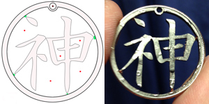 Kanji Symbol for God. Notice the green areas. This is for "overcutting" which will cause the symbol to appear as if it is floating. This is done by angling the blade so that the top comes to a wedge below the top surface, but is supported by a wider base below.